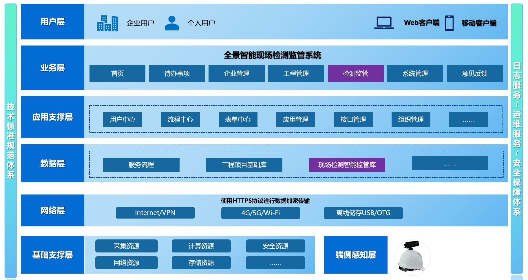 “全景智能现场检测监管系统”不仅是对传统作业模式的改良,更是一场全面而深刻的技术重构。该系统创新性地构建了基于“端—云—用”一体化架构的数字化解决方案,以“360°全景感知终端 + 全流程无纸化作业”为核心抓手,有效改善了传统模式下“设备离散、记录依赖人工”的低效状况,助力作业模式向更高效、智能化的方向升级。